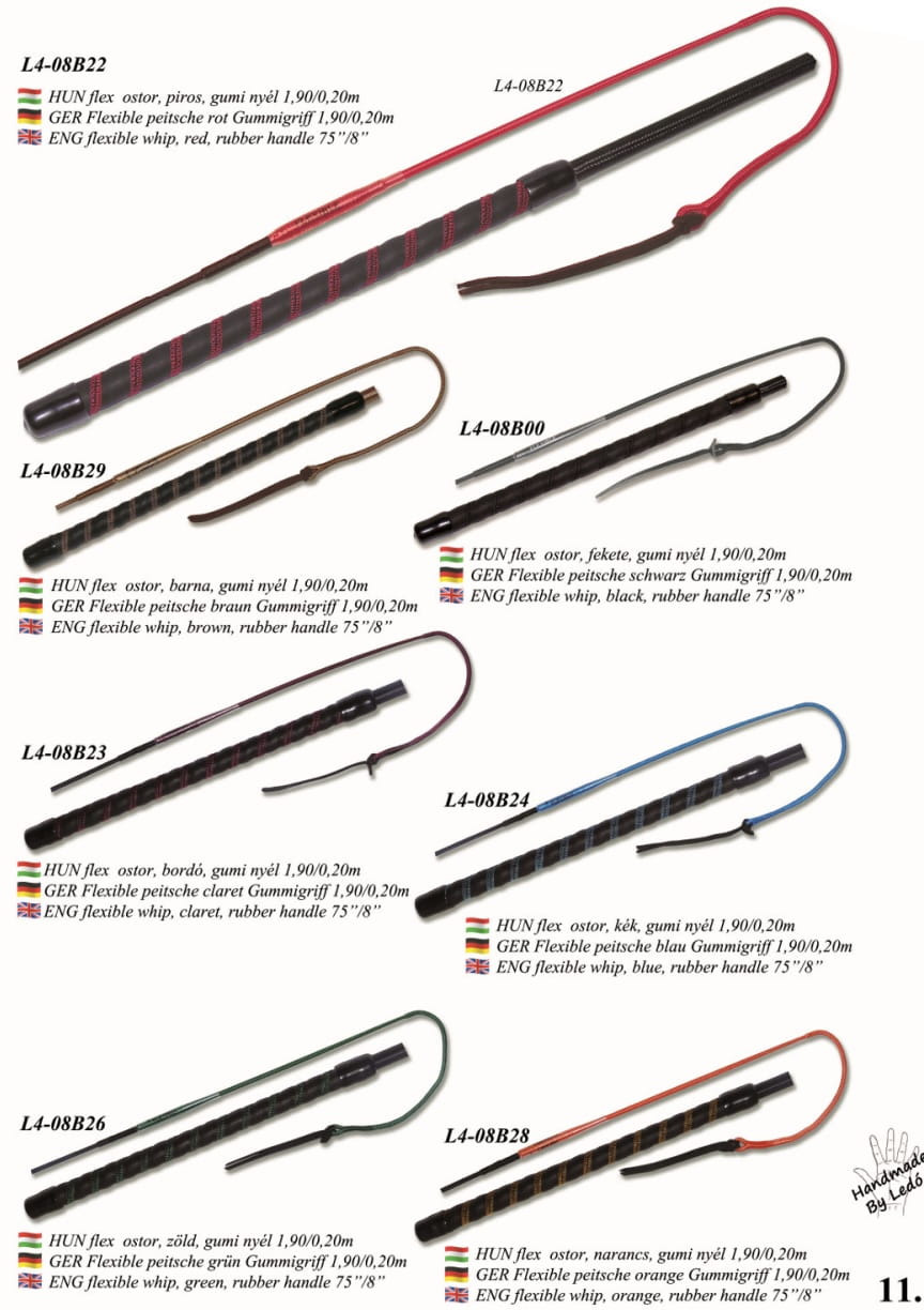 Bat wykonany z pełnego włókna szklanego z elementem Flexible łączącym końcówkę z biczyskiem dającym dodatkową elastyczność. Końcówka łukowa w długości 20 cm zakończona skórzanym pędzelkiem. Rączka wykonana z połączenia syntetycznego nubuku oraz gumy. Dostępny w różnych kolorach