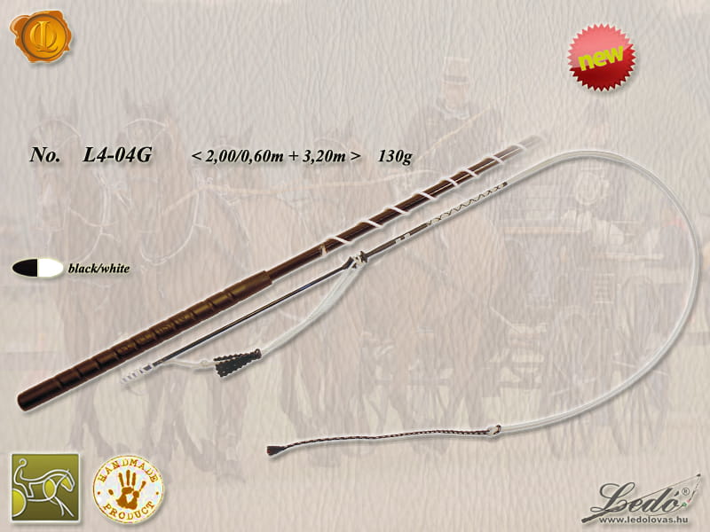 Bat wykonany z rurki z włókna szklanego (lekkość) przeznaczony do powożenia zaprzęgami czterokonnymi. Końcówka łukowa w długości 60 cm oraz dodatkowy bat opleciony wokół biczyska. Rączka gumowa.