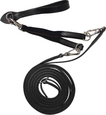 Czarna wodza skórzana zakończona karabinkami do przypięcia do popręgu oraz elastycznym amortyzatore. W zestawie pętelka ze skóry z półkółkiem do popręgów nie posiadających okuć do podpięcia wodzy dodatkowych. Bardzo trwała. Szerokość części do ręki 16 mm.