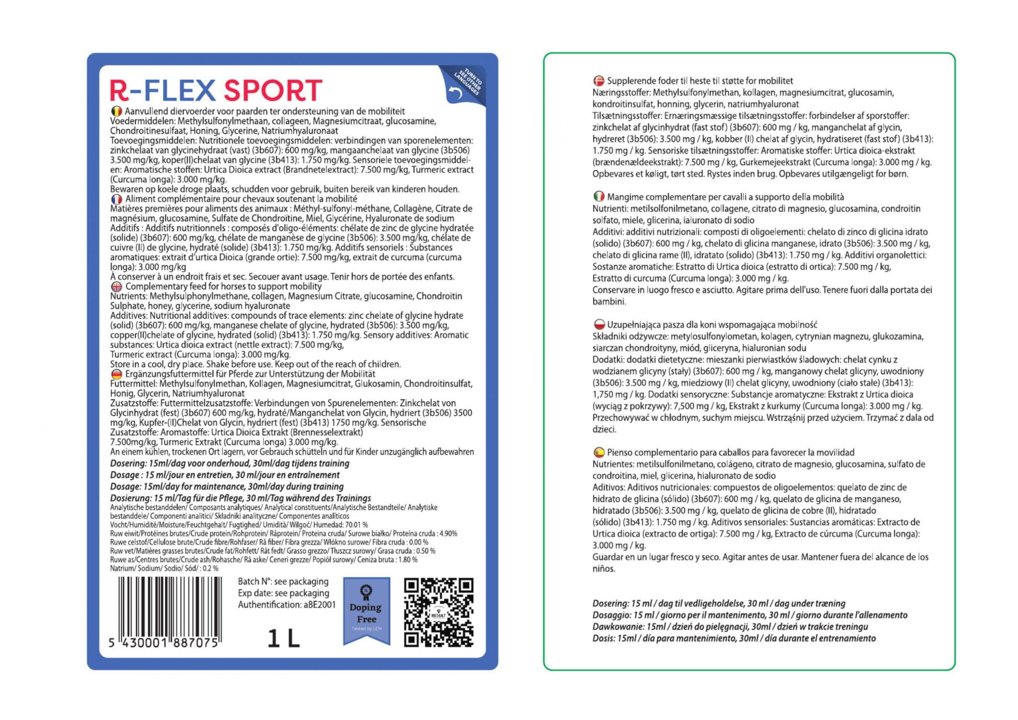 R-Flex Sport to suplement wspomagający mobilność koni w intensywnym treningu i zawodach. Oprócz surowców użytych w R-Flex (MSM, glukozamina, chondroityna), ulepszono ten suplement o składniki wspierające potrzeby Twojego konia sportowego. Dodatek kwasu hialuronowego zapewnia lepsze nawilżenie stawów szczególnie przy zachowaniu dawki 120mg/dzień w 30 ml/dzień. Dodano również kolagen, aby zapobiec rozpadowi chrząstki. Suplement zawiera w składzie wyjątkową mieszankę kurkumy i miodu - ta kombinacja jest znana jako naturalny antybiotyk. Dodatkowo ta mieszanka zawiera ekstrakt z pokrzywy poprawiający przepływ krwi. Minerały, takie jak mangan, cynk i miedź (wszystkie w postaci glicynianu) oraz bardzo silny przeciwutleniacz uzupełniają listę składników.
