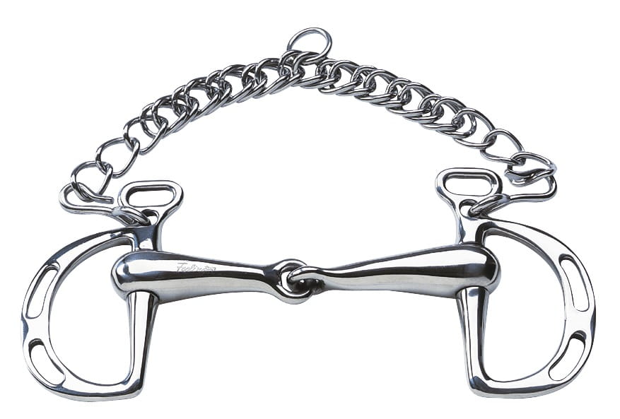 Wędzidło typu Kimberwick pojedynczo puste. Wykonane ze stali nierdzewnej. W komplecie z łańcuszkiem i haczykami ze stali nierdzewnej.