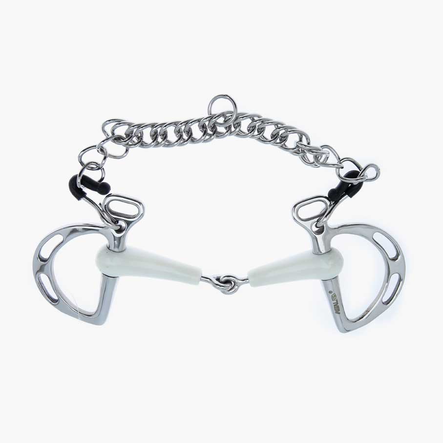 Wędzidło typu Kimberwick pojedynczo łamane ze ścięgierzem z tworzywa sztucznego Flexi. Boczki wykonane ze stali nierdzewnej. W komplecie z łańcuszkiem i haczykami ze stali nierdzewnej.