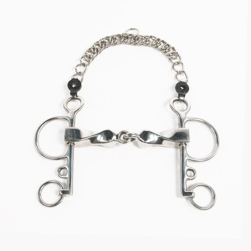 Wędzidło pelham wykonane ze stali nierdzewnej, ścięgierz 1x łamany, pełny, skręcony, gruby, czanki długie. Wędzidło dość ostre, przeznaczone dla koni mocno wpierających się w wędzidło. Dla doświadczonych jeźdźców ze spokojną ręką.