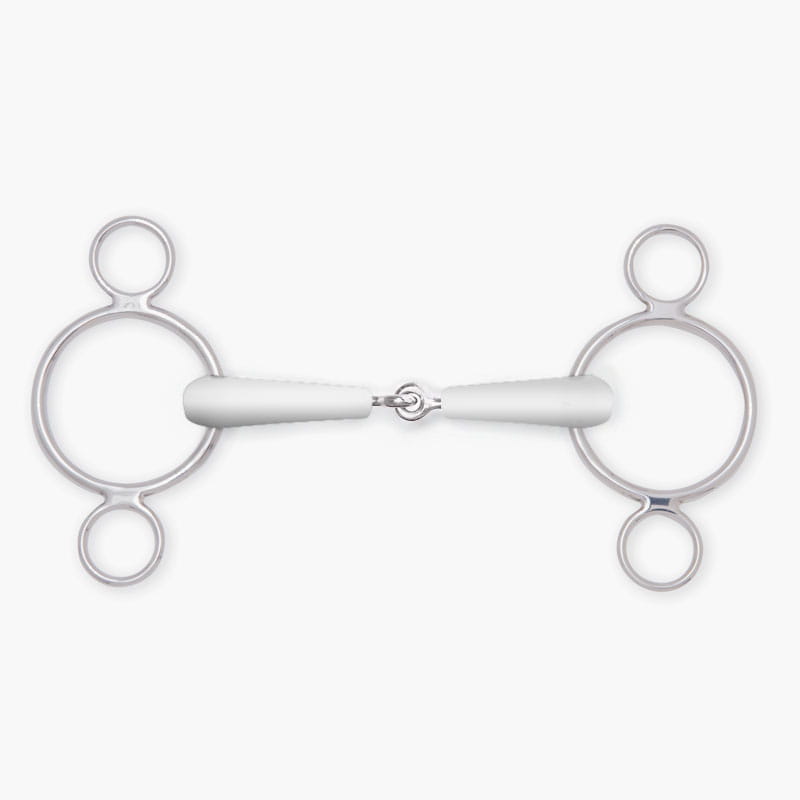 Wędzidło wykonane z tworzywa sztucznego. Pojedynczo łamane. Pierścienie ze stali nierdzewnej.